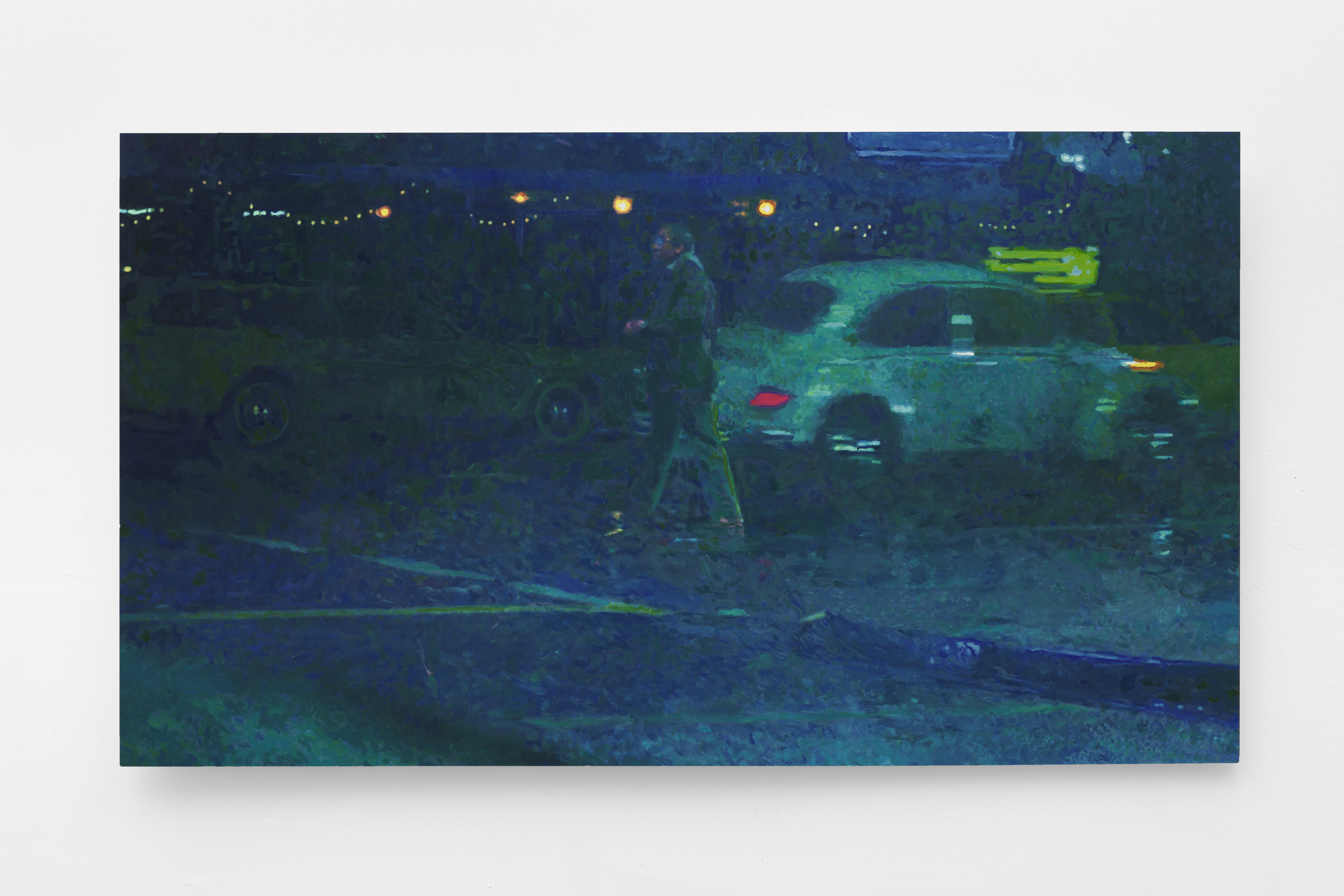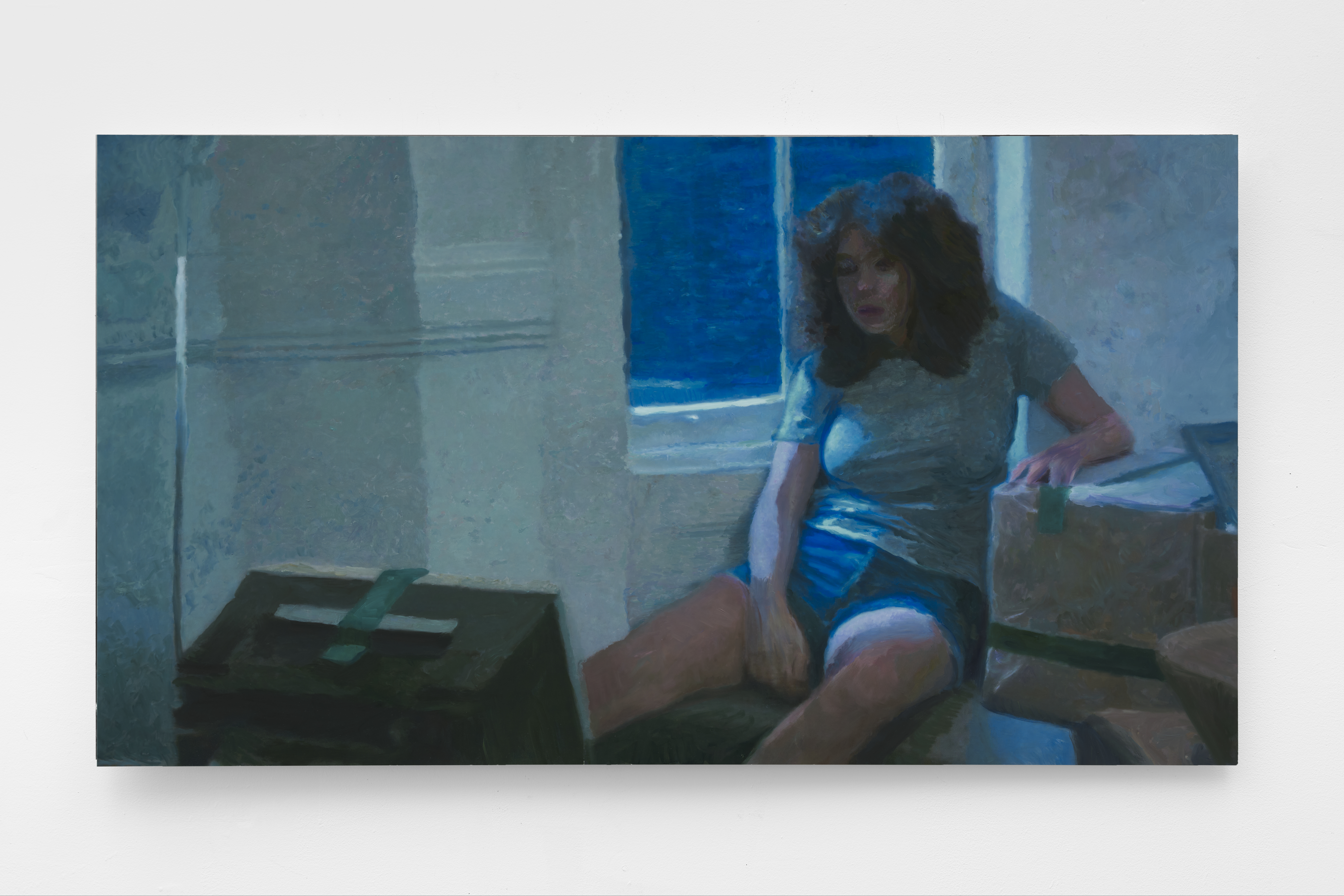 Seated in October in front of blue wall, 2025 Oil on aluminum 26 x 47 in.