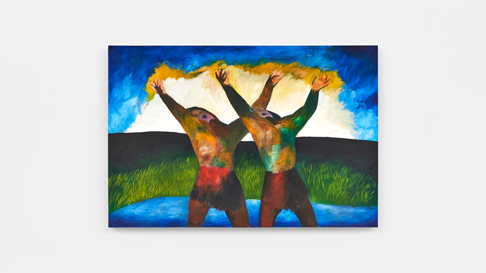 Ellon Gibbs addresses humanity’s primal nature. Working in oil and acrylic, he paints what he calls “figures of the spirit” against “fever dreams” of colorful, sometimes fearsome, landscapes. His genderless, faceless figures assume postures such as crouching, grappling, embracing, or standing with a fist raised to the sky. Gibbs says the crouch signifies “birth, death and rebirth” — evoking the protective fetal position as well as prostrate prayer. His paintings equally acknowledge the awesome power of nature in the age of climate catastrophe. In his dynamic works, drama unfolds between human beings and their environment.