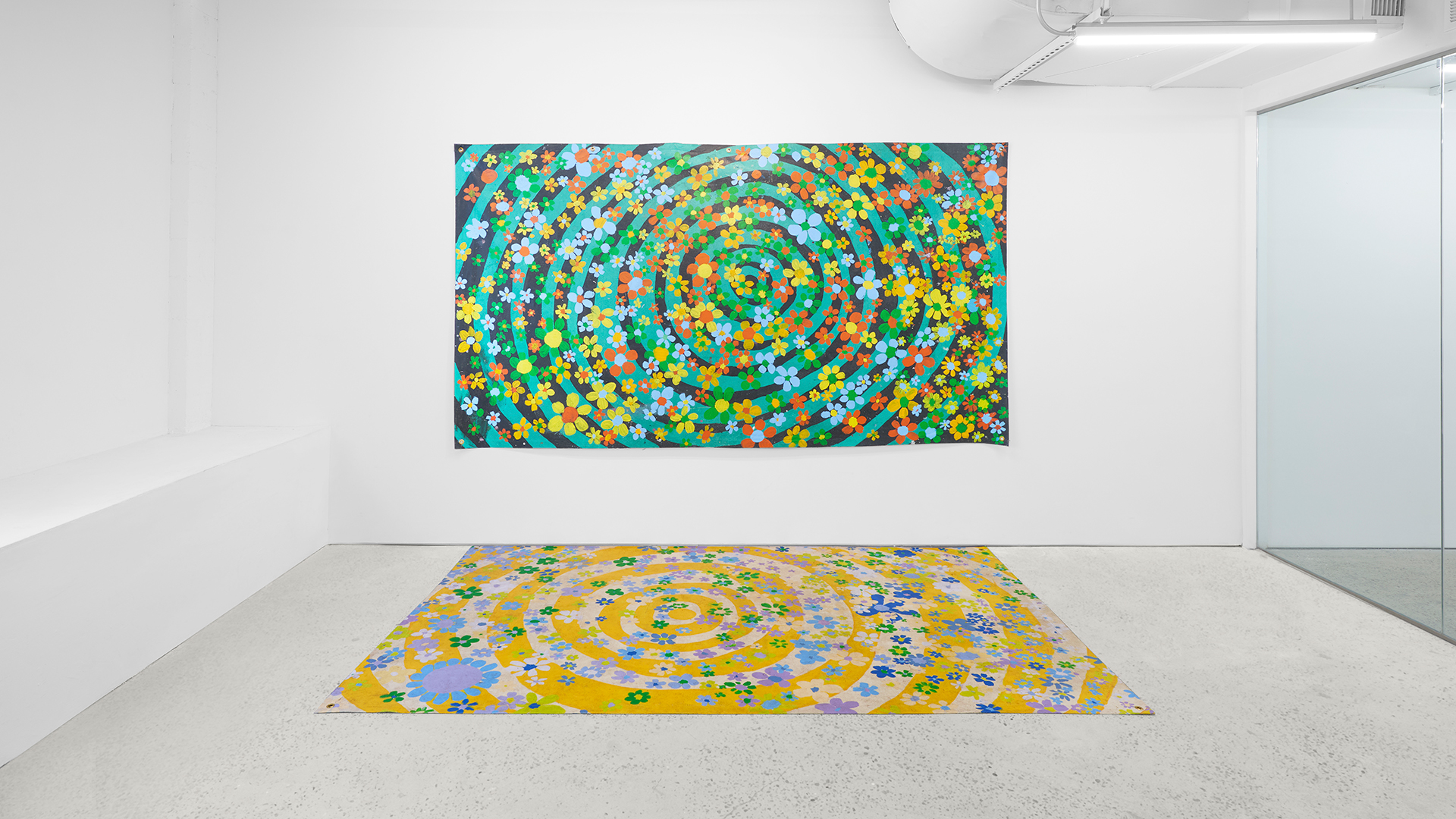 Beatrix, a smaller work that was adapted into the large-scale mural, represents a new, hyper visceral kind of Ripple: the mother, the final boss. The daisies are larger than your head, the life-sized vortex large enough to suck you in. Sheldon likes to play with the idea of adornment, whether it's by arranging flowers or hanging a space with floor mats. What happens when you pin something meant for the floor on a wall? The bird's eye image of the flower bucket returns though the vantage point has shifted, forcing it to eye-level. The paintings want you to stare them in the eye, too.