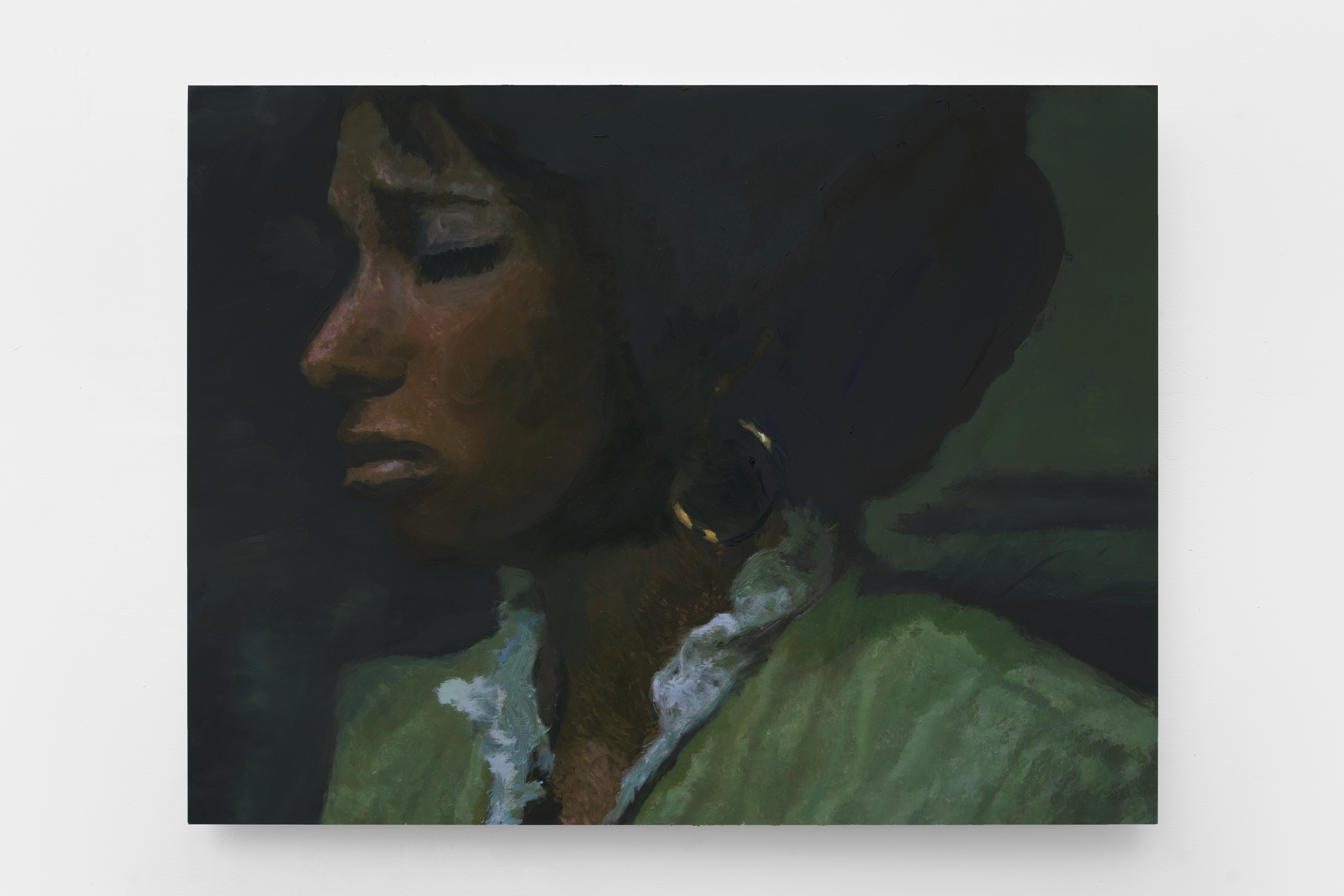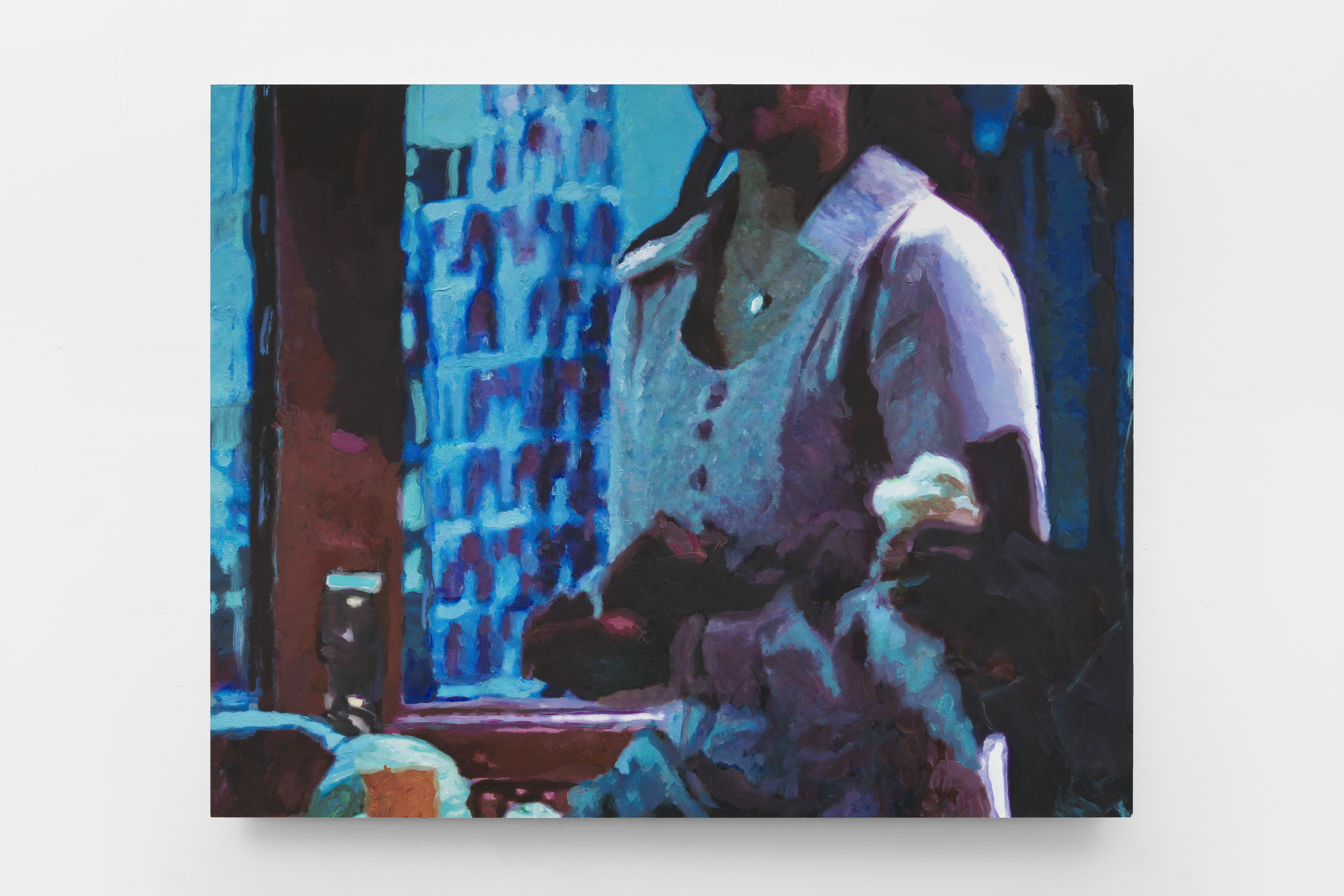 Seated in October in front of blue wall, 2025 Oil on aluminum 26 x 47 in.